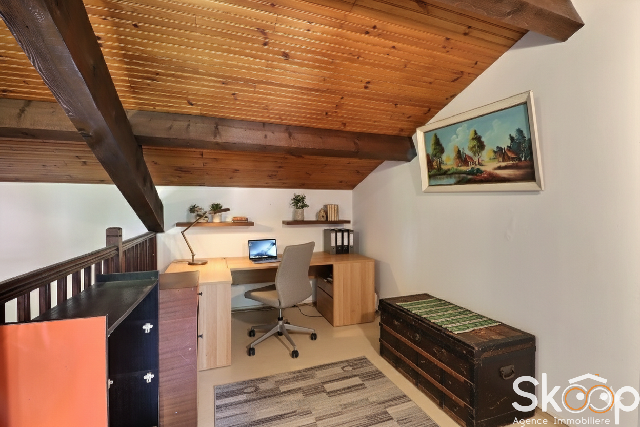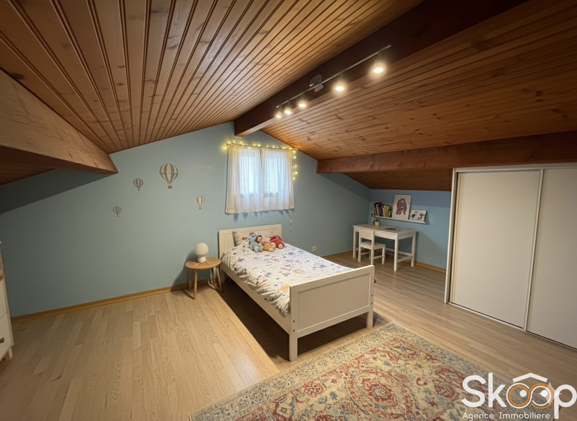 À l’étage, deux chambres supplémentaires, un palier pouvant faire office de bureau, ainsi que des combles aménagés pouvant accueillir une chambre supplémentaire.