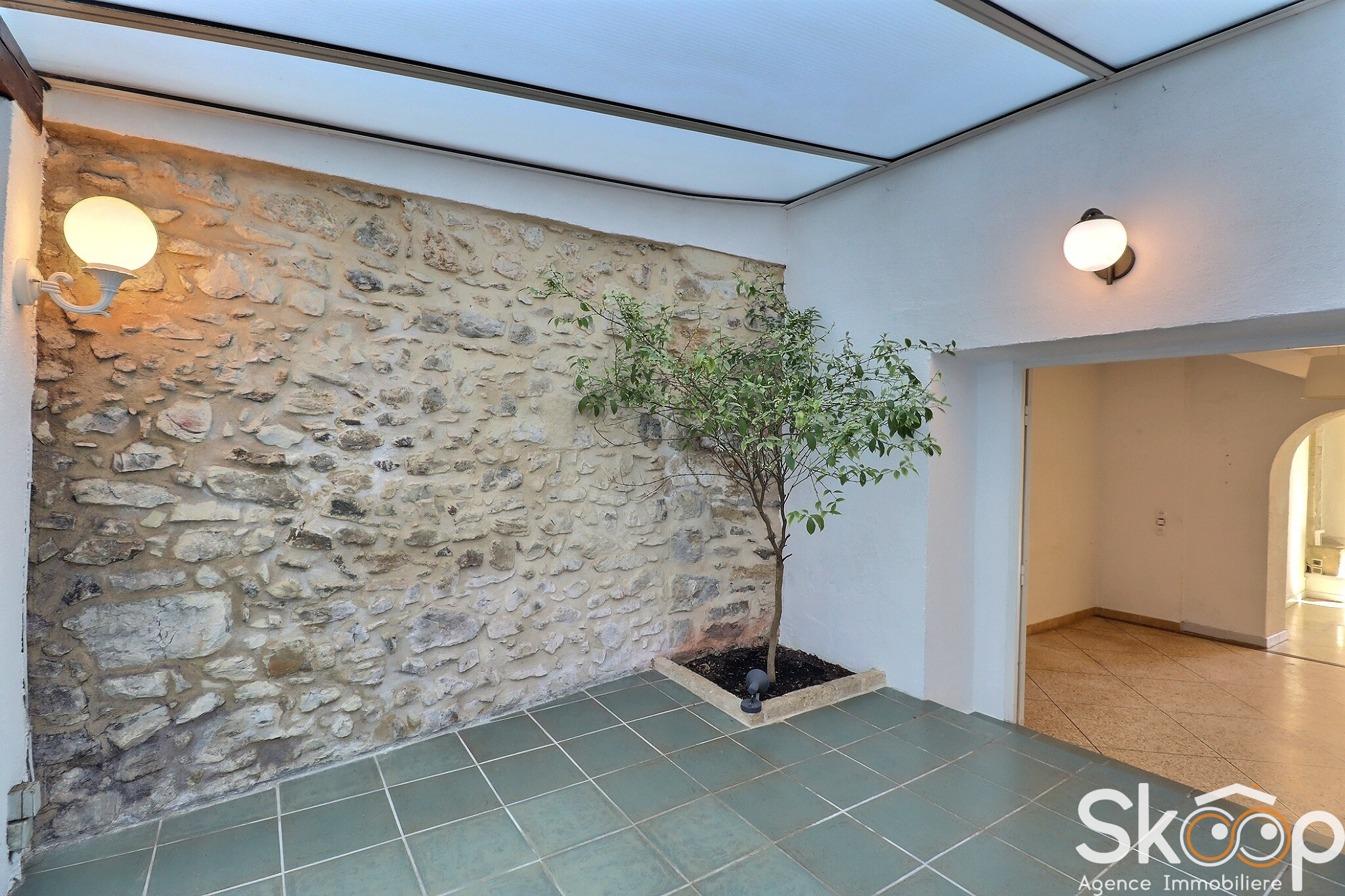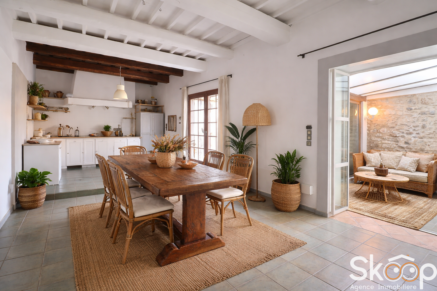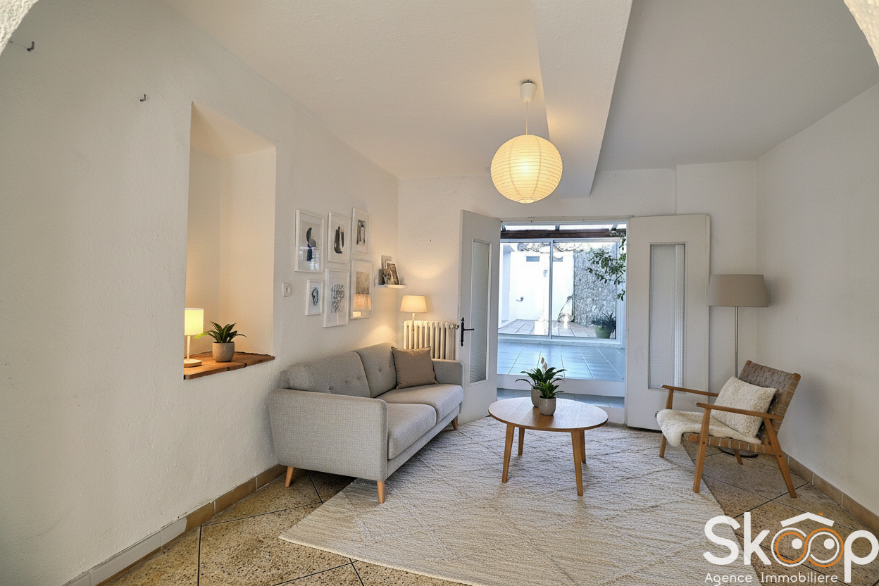 Elle séduit par ses beaux volumes et son atmosphère chaleureuse, avec au rez-de-chaussée un salon, une véranda lumineuse agrémentée d’un mandarinier, ainsi qu’une grande pièce de vie avec cuisine ouverte, donnant sur une cour intime.