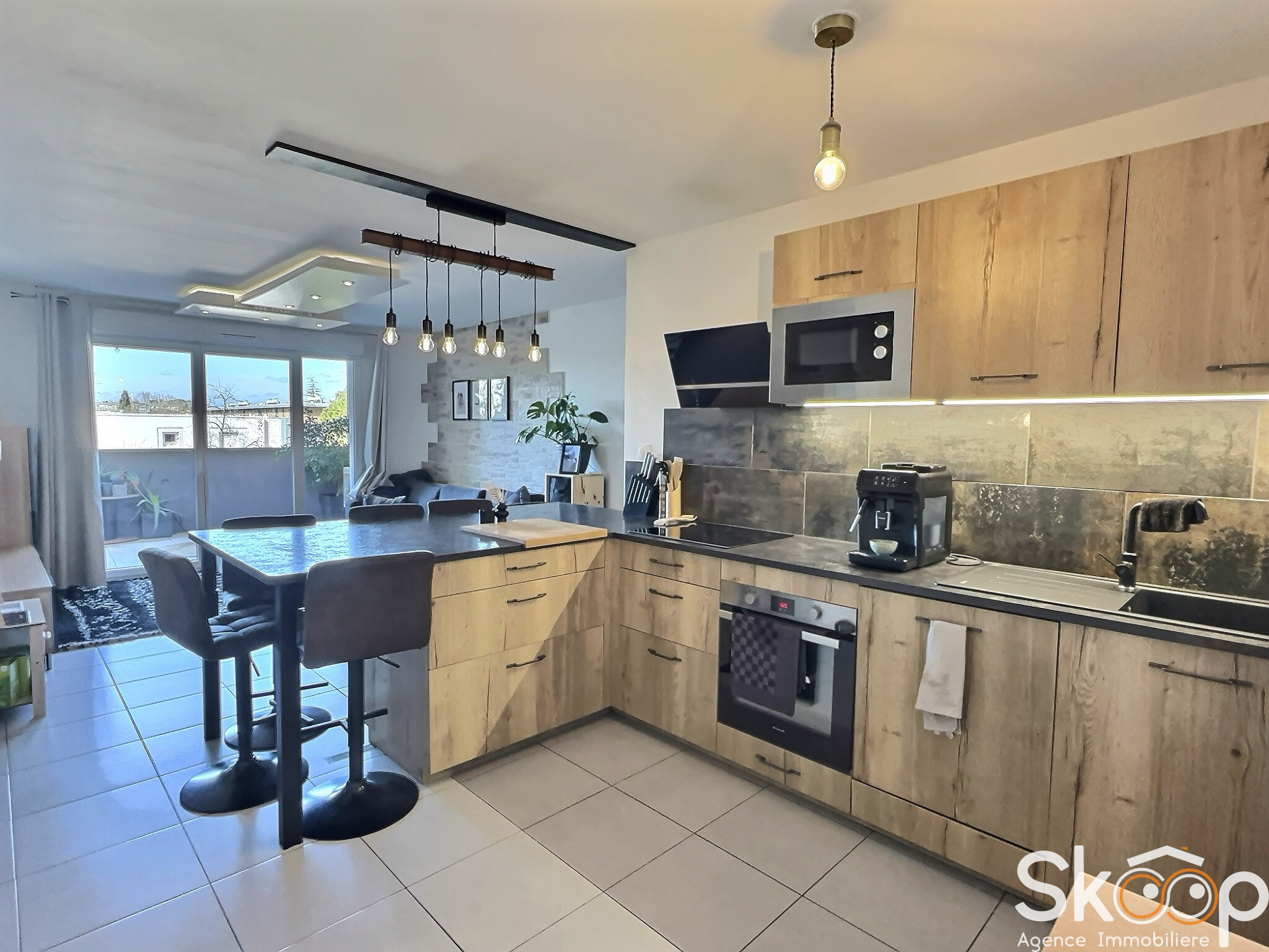 L'appartement se compose d'une cuisine ouverte sur le séjour, deux chambres avec placard, une salle d'eau avec coin buanderie et un WC indépendant.